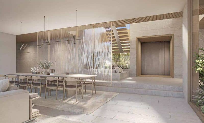 Every villa ensures direct entry to its private beach. The interiors showcase a natural colour palette that includes coral, brown, blue, beige, saffron, and grey tones. Wood, marble, and raw stone elements elevate the overall design, creating an atmosphere of refinement and sophistication.